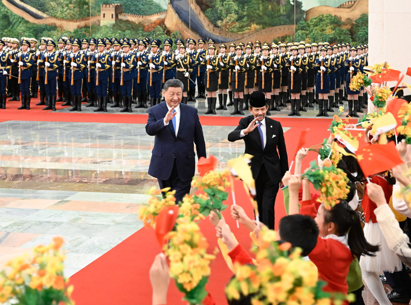 2月6日上午,国家主席习近平在北京人民大会堂同来华进行国事访问的文莱苏丹哈桑纳尔举行会谈。这是会谈前,习近平在人民大会堂北大厅为哈桑纳尔举行欢迎仪式。新华社记者 申宏 摄