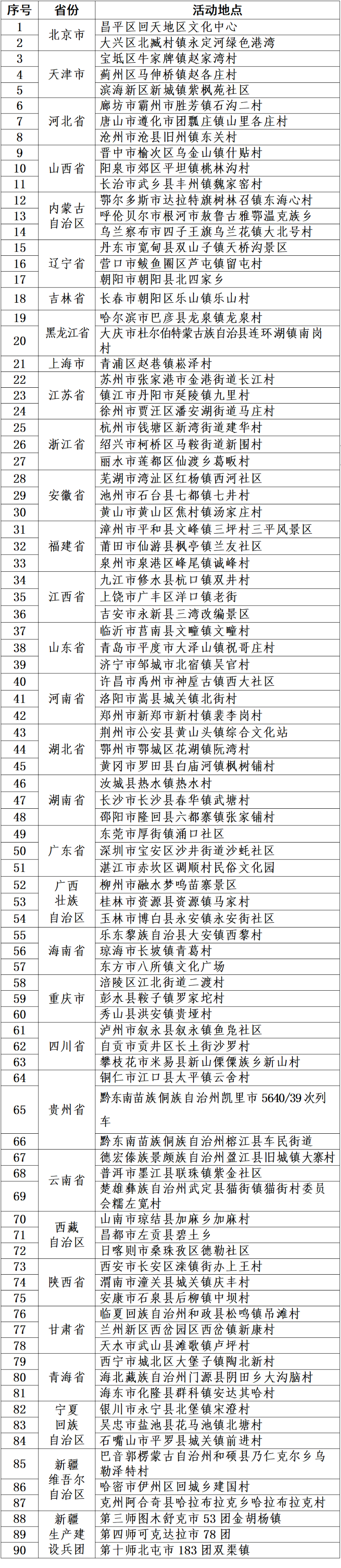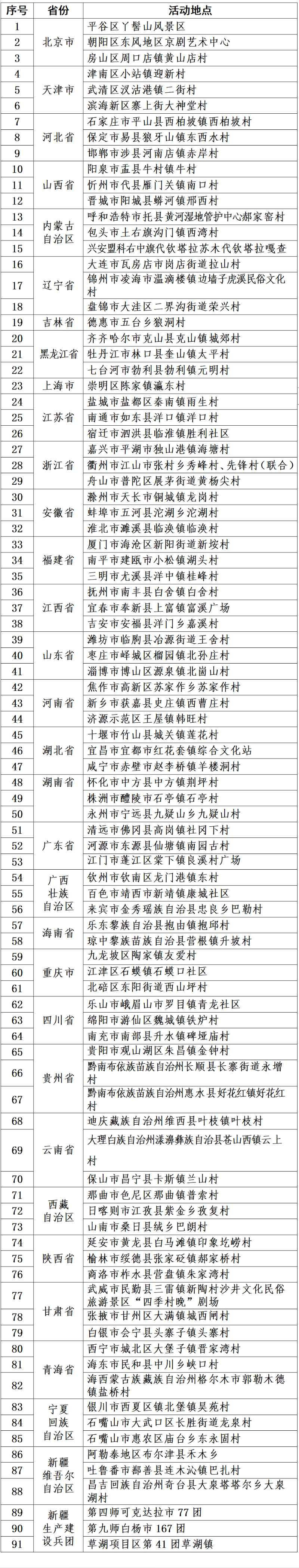 根据《文化和旅游部办公厅关于开展2024年“四季村晚”活动的通知》要求,在各省级文化和旅游行政部门申报推荐的基础上,文化和旅游部研究确定2024年春季“村晚”主场设在重庆市长寿区,夏季“村晚”主场设在黑龙江省佳木斯市,秋季“村晚”主场设在安徽省黄山市,冬季“村晚”主场设在四川省攀枝花市,并确定了2024年全国“四季村晚”示范展示点名单,现予公布。