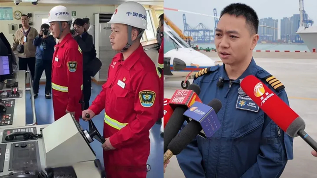 媒体代表集中采访救捞系统一线船舶、机组人员。(拼版照片)海南文明网 供图