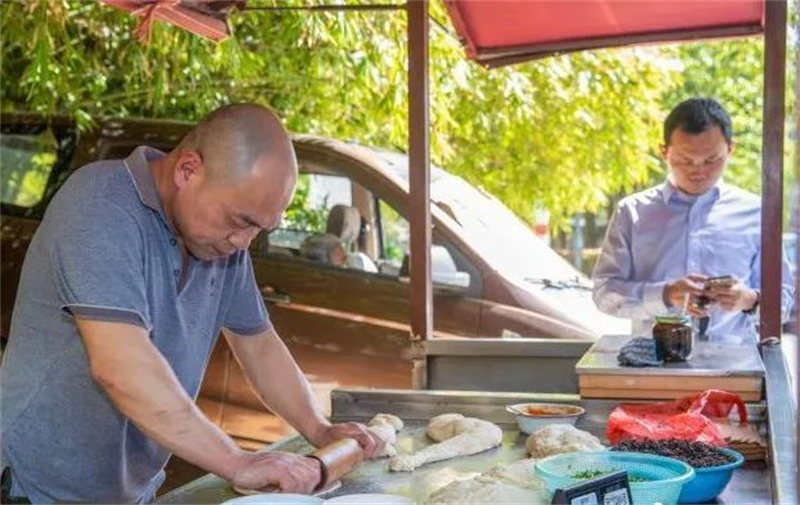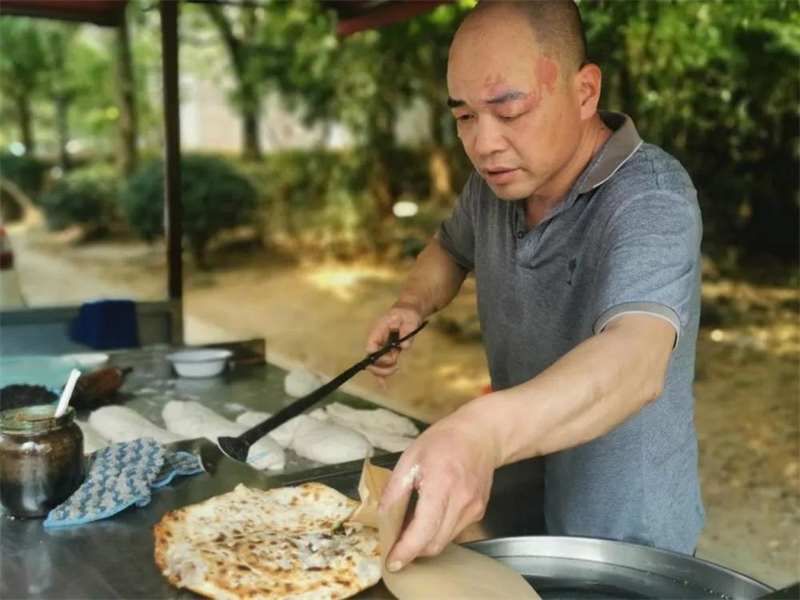 曹加齐站在摊位前,一边忙着烤制烧饼,一边与顾客搭话。来买烧饼的人很多,不光是他的烧饼价格便宜,而且烧饼的馅,也比别人多了一个肉圆。一来二去,曹加齐做的烧饼,在县城的名气越来越大。