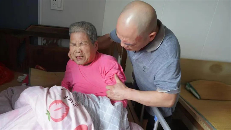 50岁的曹加齐端着一碗番茄鸡蛋面糊汤,来到母亲于粉英的床前。73岁的母亲因帕金森晚期,生活不能自理,躺在床上,目光游离。