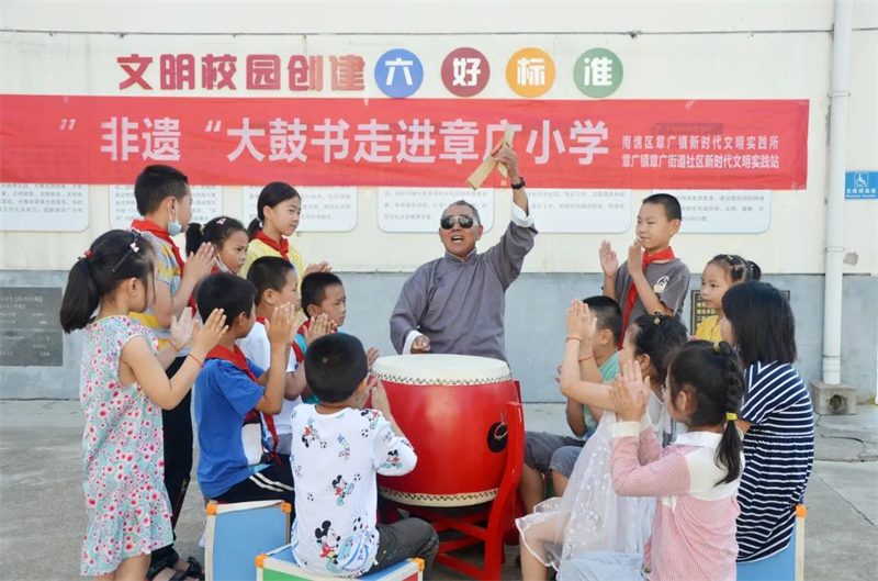 刘学文带大鼓走进校园,为孩子们表演非遗节目。