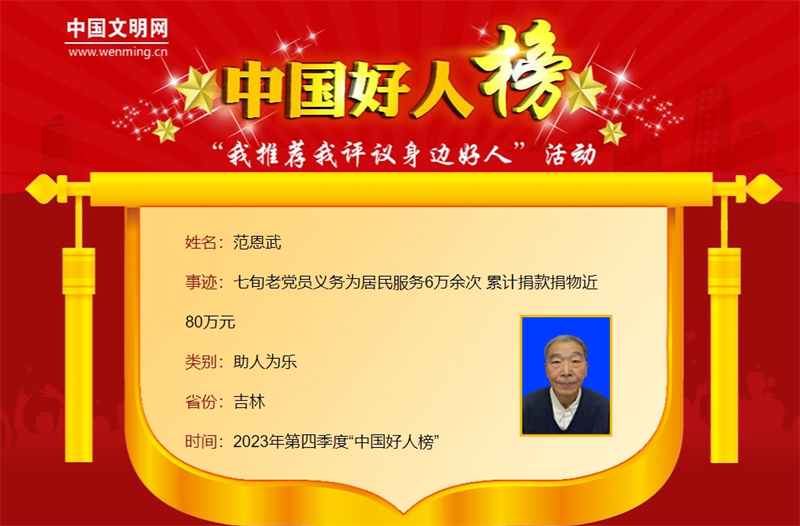 从帮助身边人到服务社会,从一个人献爱心到带动更多人加入志愿服务团队,1951年出生的范恩武用点滴善举践行着“多为群众做好事”的诺言。多年来,他坚持每天走街串巷,为群众提供义务服务,累计修理了4万多双鞋子、2万多辆自行车等。