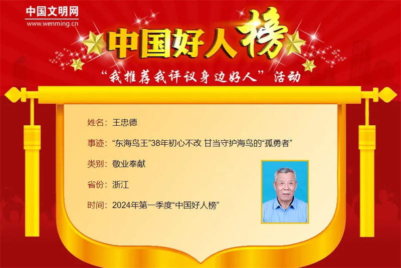 2022年11月,《湿地公约》第十四届缔约方大会在湖北武汉和瑞士日内瓦同步举行。会议期间,发布了《中国水鸟保护十佳案例》,其中就包括中华凤头燕鸥。这个消息传到舟山市定海区马目社区(原马目乡)黄金湾村村民王忠德耳中,他抑制不住内心的喜悦,激动的泪水滑落面颊。