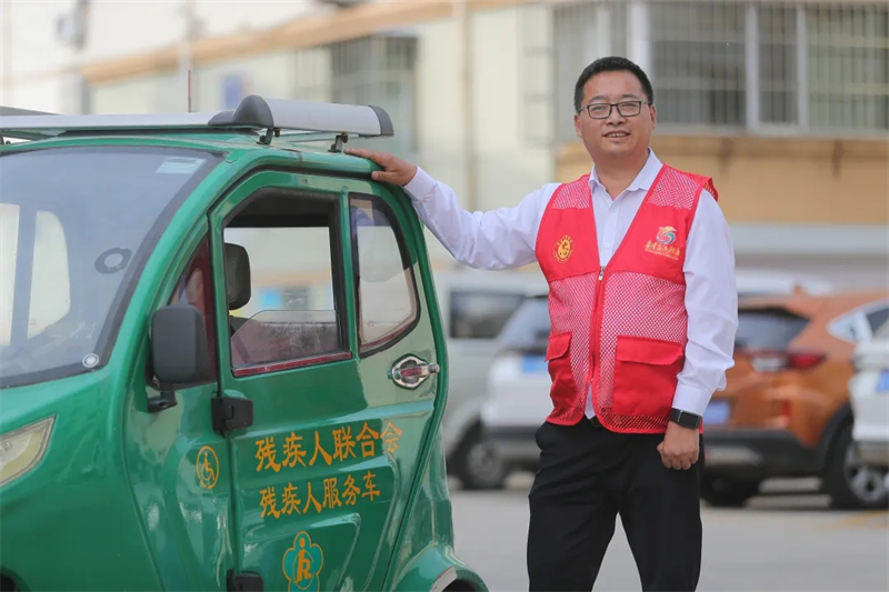 栾志学与陪伴自己多年的残疾人服务车。河北省文明办供图