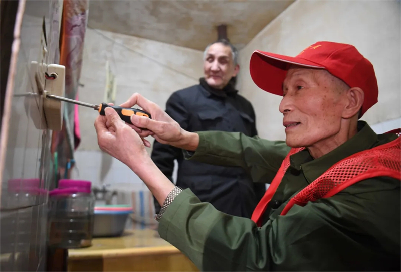 71岁的熊昌金帮助65岁的熊光林检修家里松动的电源插座。图片来源:长江日报