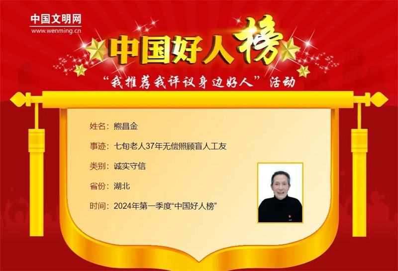 年过七旬的熊昌金和比他小6岁的熊光林,是同一个工厂的退休工人。当年刚进厂时,熊昌金是名电工,视力残疾的熊光林则负责简单的机械操作。当过兵又身为党员的熊昌金,对待工友十分热心。有一次,熊昌金见盲人工友熊光林因厂门外的井盖没盖好摔倒,他连续两天把厂子周边所有井盖检查一遍,发现有破损的立即向厂里反映,要求尽快补上。老厂长知道后,嘱托熊昌金平时要多关照熊光林。熊昌金当场承诺:“一定会尽全力帮助他。”