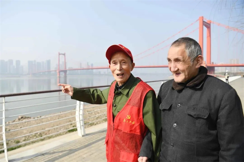 熊昌金(左)引着熊光林到附近的长江边春游、晒太阳,感受春天的气息。图片来源:长江日报