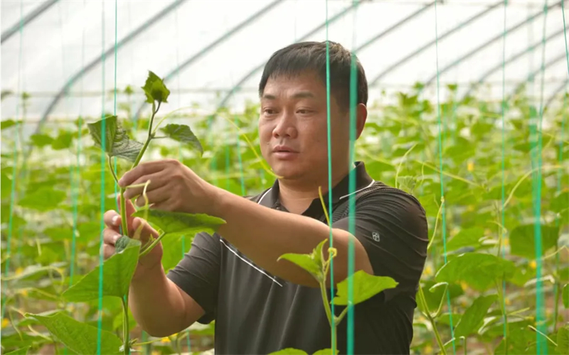 刘天民在大棚内查看农作物生长情况。天津市文明办供图