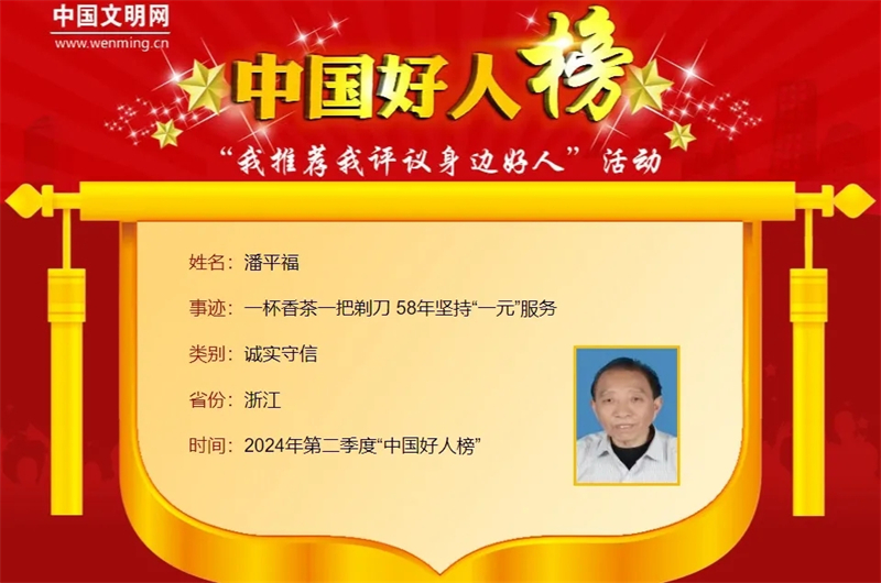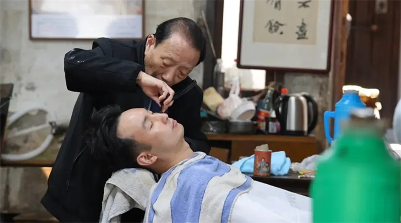 潘平福为顾客理发、刮面。图片由浙江省文明办提供
