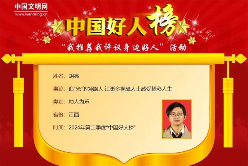1984年,胡亮出生于江西吉安的一个盲人家庭,自4岁起就高度近视。2008年,他右眼第一次视网膜脱落,左眼视力微弱。