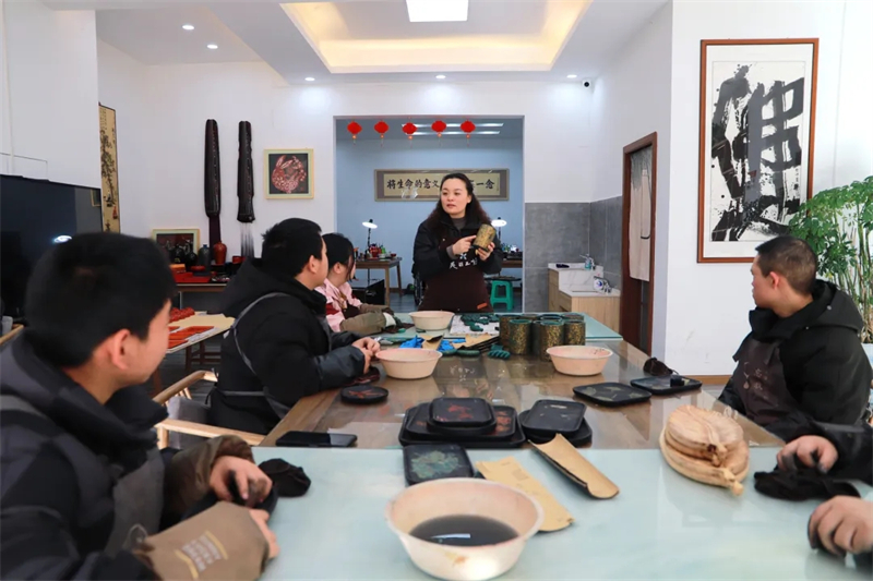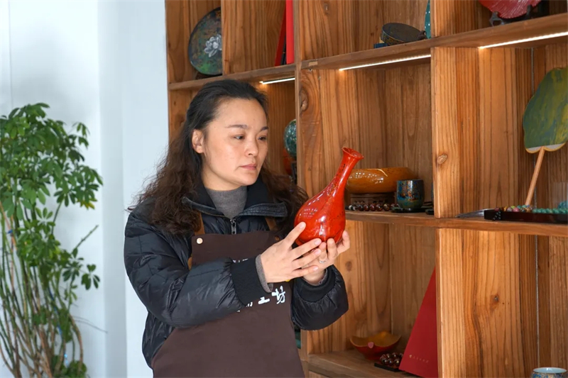 袁秋检查漆器成品。重庆市城口县委宣传部供图