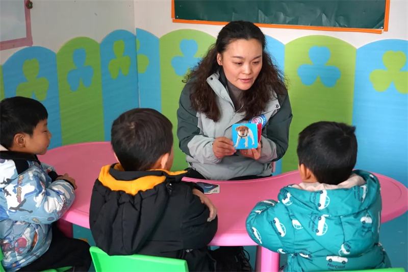 袁秋拿着动画卡片为孩子做康复训练。重庆市城口县委宣传部供图