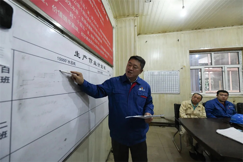 刘伯鸣在中国一重集团有限公司的厂房会议室内布置当日生产任务、操作重点及注意事项。新华社记者 王松 摄