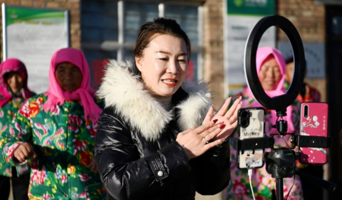 杨清艳通过网络直播方式销售环县庄子峁生态农庄辣椒面。甘肃省文明办供图