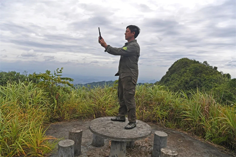 黄通甫在龙道山护林点工作站调试卫星电话。新华社记者 周华 摄