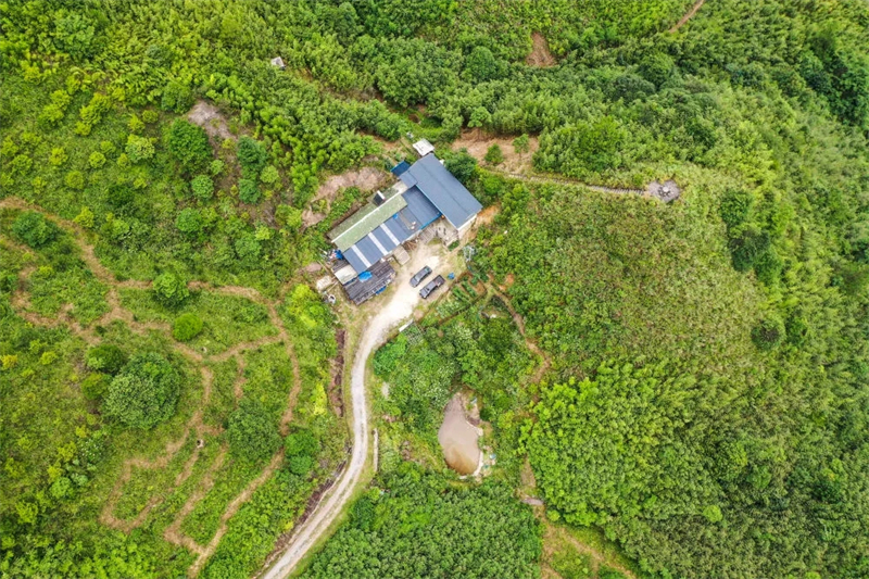 这是黄通甫与妻子黄日秀常年驻扎的龙道山护林点工作站(无人机照片)。新华社记者 曹祎铭 摄