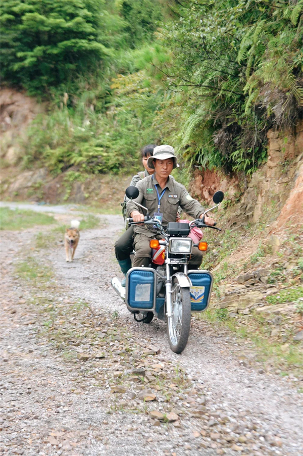 黄通甫带着妻子黄日秀,骑行在巡山护林的路上。新华社记者 崔博文 摄