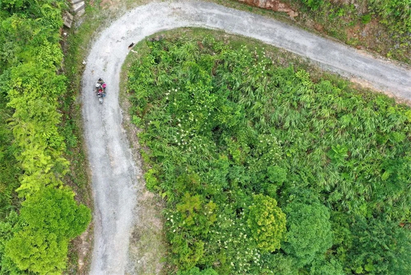 黄通甫和妻子黄日秀骑行在巡山护林的路上(无人机照片)。新华社记者 周华 摄