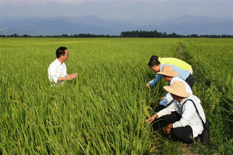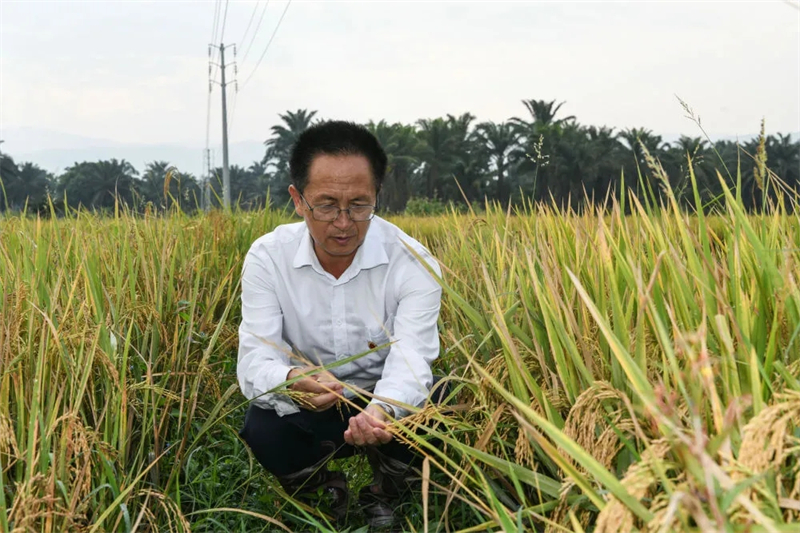 杨华德在田间查看杂交水稻(右)和当地水稻。新华社记者 韩旭 摄