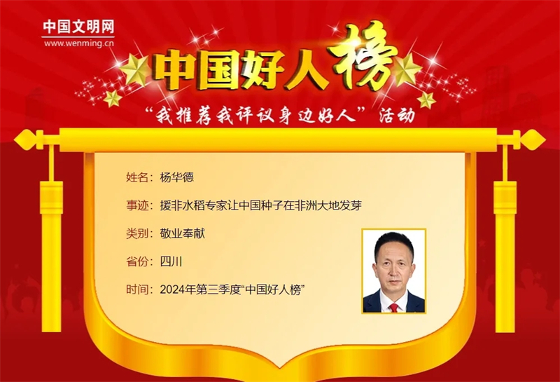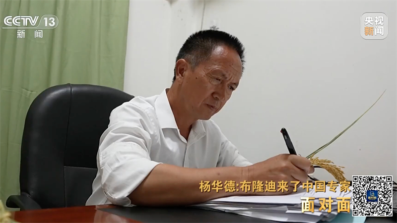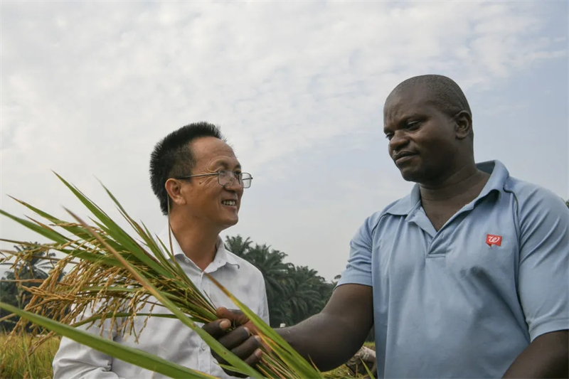 杨华德(左)在稻田间和当地夏尔交流。新华社记者 韩旭 摄