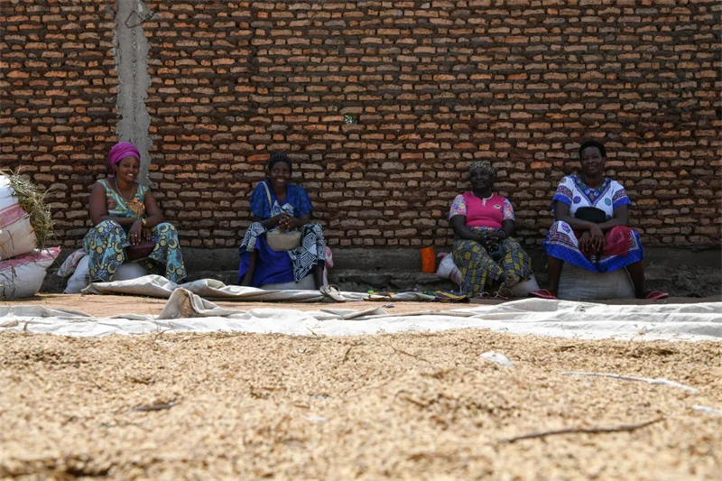 在布隆迪布班扎省吉汉加县,农民晾晒稻谷。新华社记者 韩旭 摄