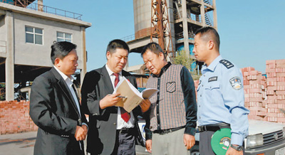 图为韩旭辉(左二)在马厂法庭辖区某厂区现场勘验。张都锁 摄