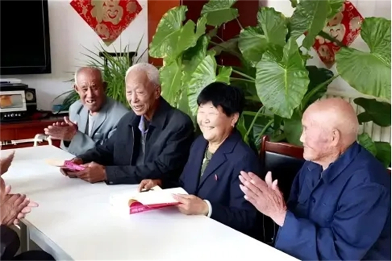 “大孝闺女”周汝珍(右二)和她照顾的老人们在一起。青县文明办供图