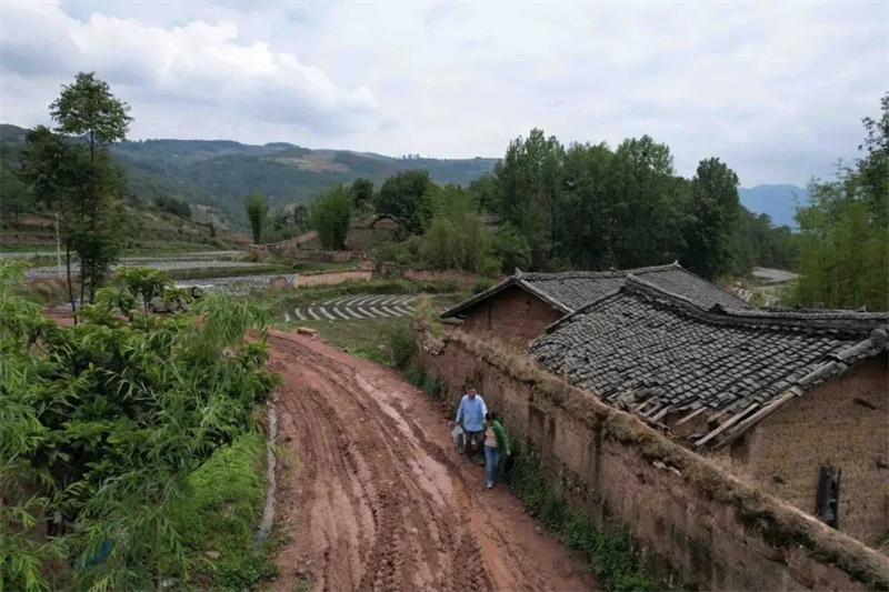 部分山区出行条件艰苦,忻元华和滕崇小心走过一段泥泞路面。图片来源:宁波晚报