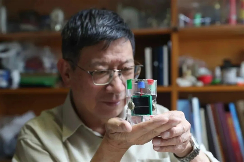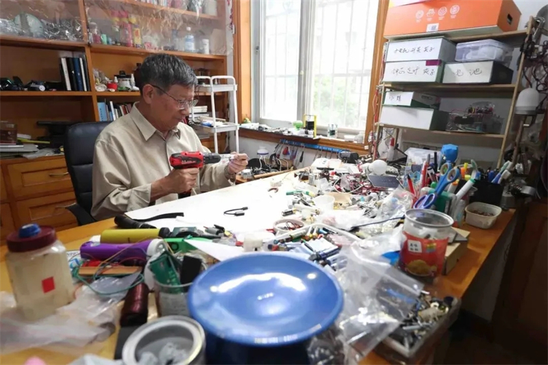 忻元华在研究他十分满意的作品——高灵敏阴天太阳能电动机。图片来源:宁波晚报