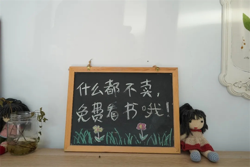 岛上书店门口竖起的小黑板写着:“什么都不卖,免费看书哦!” 新华社记者 俞俭 摄