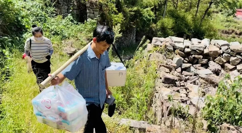 中午,车子到了与三门交界的宁海县里王村。郑志会把车停在山脚下,拿出药箱、药品,大米、洗衣液等爱心物资,还掏出了一根木棍当扁担,把东西挑了起来。
