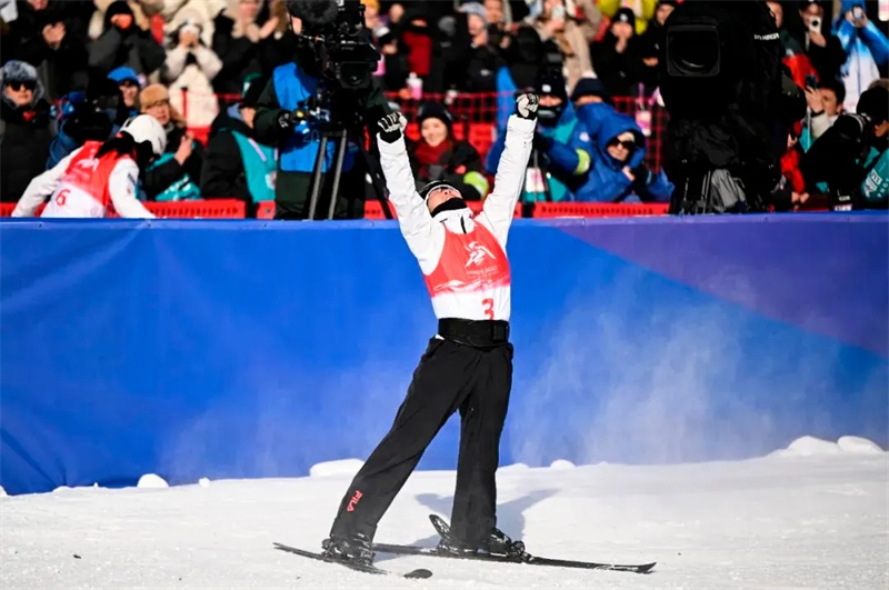 2025年2月9日,徐梦桃在赛后庆祝。当日,在第九届亚冬会自由式滑雪女子个人空中技巧决赛中,中国选手徐梦桃夺得冠军。新华社记者 夏一方 摄