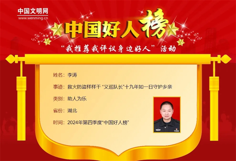 他牵头建立义务巡逻队、消防队守护全村,巡逻、救火、救送病人等,样样都干……他就是湖北省荆门市掇刀区麻城镇义务巡逻队队长李涛。