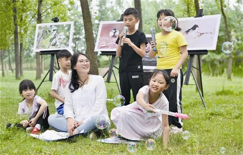 陈木兰与喜爱阅读的孩子们开展户外活动。湖北省文明办供图