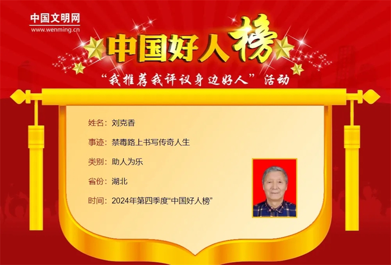 现在,儿子小清成功戒掉了毒瘾,刘克香一家人生活回归正常,日子过得安稳幸福。越来越多的“刘克香”们也涌现出来,他们接力禁毒火炬,共同守护着“无毒净土”。(供稿:湖北省文明办)