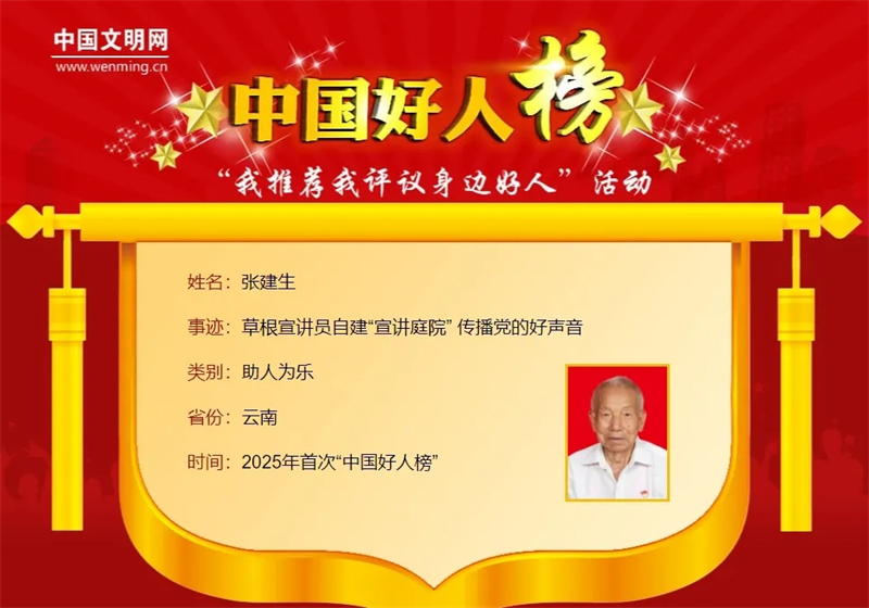 在云南省红河哈尼族彝族自治州蒙自市新安所街道文承街,年近80岁的张建生,自2007年以来一直坚持宣讲老一辈革命故事,花费65万余元把自己家小院打造成“宣讲阵地”,并且坚持免费开放。同时,他认真研读党的理论,用自己接地气的语言传播好党的声音,被当地群众亲切地称呼为“草根宣讲员”。