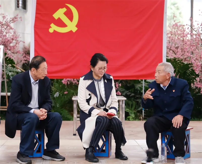 张建生和党员干部在自家院子交谈。 云南省委文明办供图