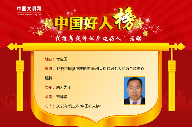 近日,2025年第二次“中国好人榜”名单揭晓,吉林省金安物业服务有限公司党支部书记贾金国凭借十七年如一日的助人为乐善举成功入选。从年轻时被称作“好人小贾”,到如今邻里口中的“好人老贾”,变的是岁月沉淀的称呼,不变的是他扎根基层、无私奉献的赤诚初心。
