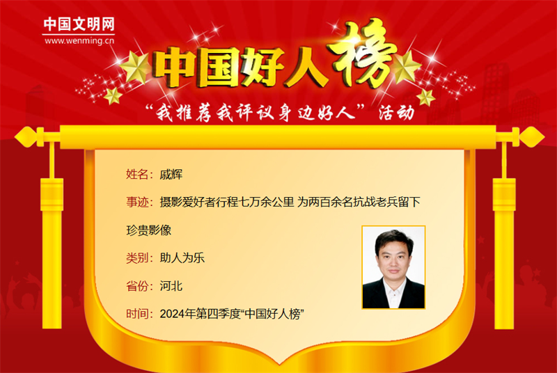 55岁的戚辉是中国联通河北唐山分公司的员工,也是一名摄影爱好者,他利用业余时间寻访抗战老兵,发起了一场关爱冀东八路军老战士的公益摄影活动,成立了一个由40余人组成的唐山公益摄影团队。11年来,团队为老兵们拍摄肖像,记录其抗战故事,关心他们的生活,足迹遍布北京、天津、河北、辽宁等省份的27个县市区,行程达7万余公里。