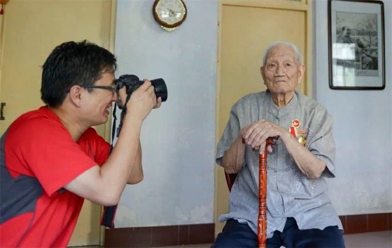 戚辉(左)在为一位八路军老战士拍照。苏晓明 摄