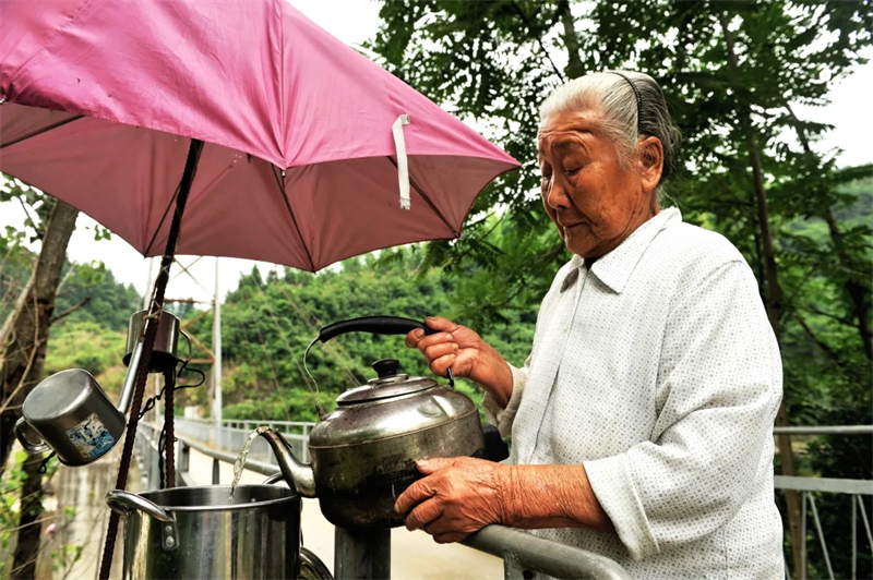 从一把小雨伞撑起的简陋小摊,到驻村工作队为她修建的专属茶亭,徐奶奶的“营业”范围升级了,但初心不变。如今,她腿脚不便,儿子郑远托接过了烧茶送茶的接力棒。面对母亲的嘱托,郑师傅点头道:“我知道,这缸茶断不得。”这大概就是最朴素的“家风传承”吧!
