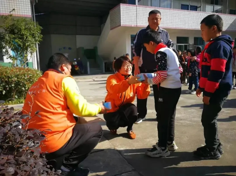 施珊娜带领团队向偏远乡村学校的孩子们捐赠保温杯。