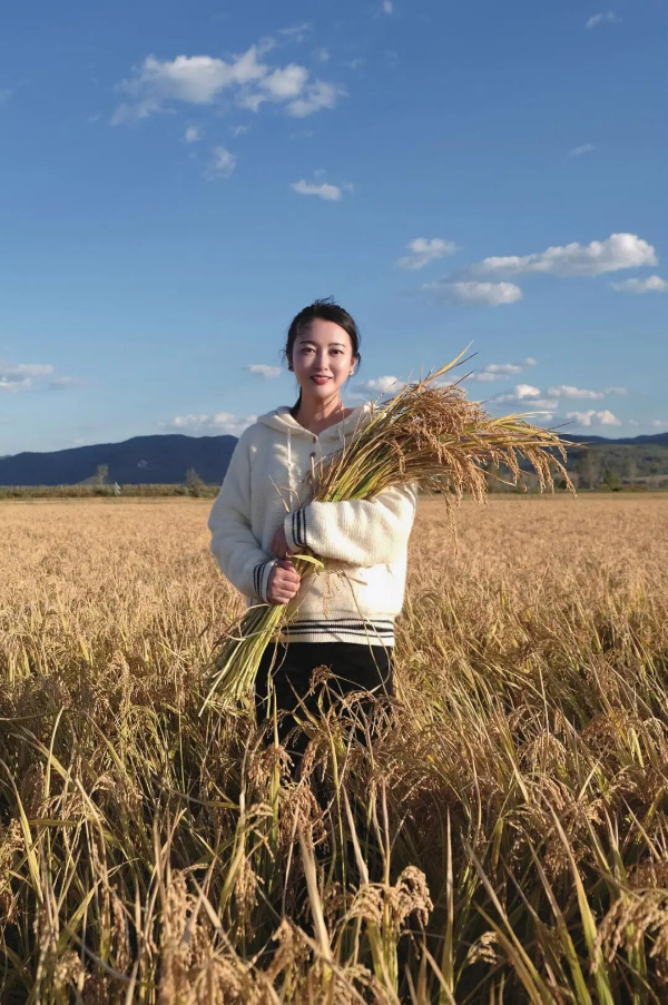 杨丽娜在光东村丰收的稻田中。吉林省文明办供图
