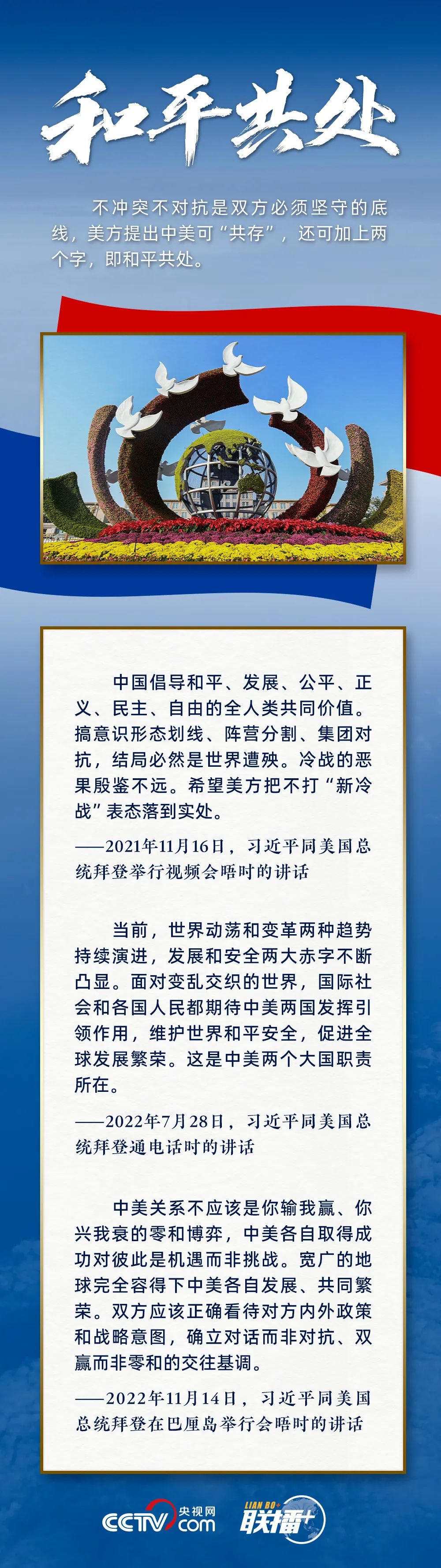 “中美不冲突、不对抗、和平共处,这是两国最基本的共同利益。”习主席指出,遵守国际关系基本准则和中美三个联合公报,这是双方管控矛盾分歧、防止对抗冲突的关键,也是中美关系最重要的防护和安全网。
