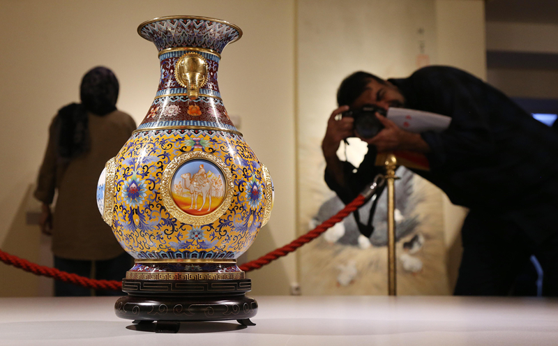 2024年10月12日,在伊朗首都德黑兰的马利克国家博物馆,观众在“丝路长云——中国艺术文化精品展”现场拍摄展品。新华社记者 沙达提 摄