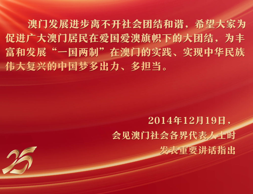 25年来,澳门社会各界在爱国爱澳的旗帜下实现广泛团结,爱国爱澳力量在社会政治生活中始终占据主导,为特区政府依法有效施政、确保“一国两制”在澳门成功实践奠定了坚实的基础。