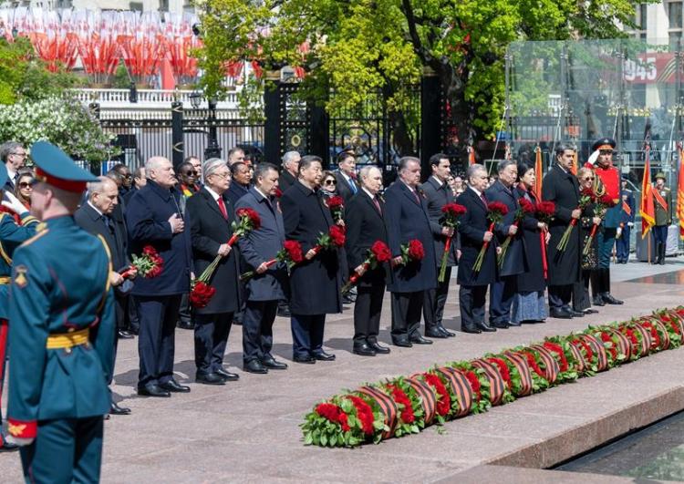 当地时间5月9日,纪念苏联伟大卫国战争胜利80周年庆典结束后,习近平主席同其他国家领导人一起从红场来到亚历山大花园,向无名烈士墓献花,并肃立默哀。