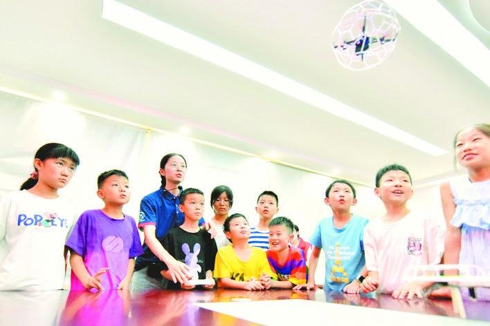 在肥东县八斗镇富旺社区,孩子们饶有兴趣地学习无人机知识。暑假期间,该社区开展形式多样的科普课程和教育活动,让孩子们在玩耍中增长知识,开阔眼界,乐享假期生活。记者 郭如琦 通讯员 高德升 摄