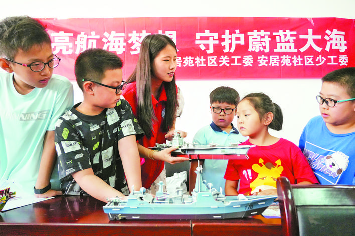 在蜀山区安居苑社区“点亮航海梦想 守护蔚蓝大海”航海日主题科普实践活动中,学生们参观船模。记者 赵瑞瑞 摄
